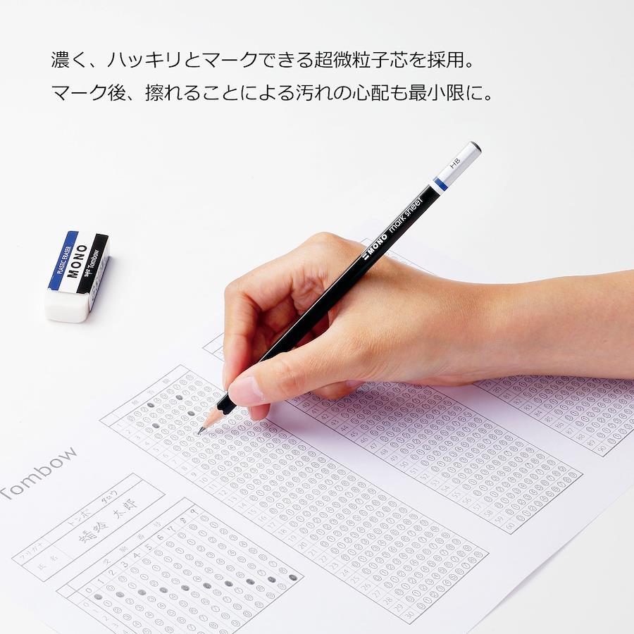 マークシート試験に最適な鉛筆「MONO マークシート」。マークシートに最適な超微粒子芯により、はっきりと塗りつぶすことが可能。プラスチック消しゴムとの相性が良く、しっかり消せてきれいな答案を作成できる。