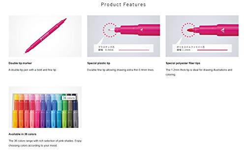 全36色のカラフルな水性サインペン。太芯:筆記線約1.2mm。特殊ポリエステルファイバー芯で、イラストなどに最適。極細:筆記線約0.4mm。特殊プラスティック芯で小さな文字もくっきりと書くことができる。同系色もニュアンス違いでたくさん用意。人気のピンクは豊富。味わいのあるダーク系カラーも揃う。