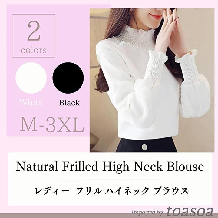 シンプルなボディにえりや袖口のさりげないフリルがかわわい清楚なハイネックプルオーバーブラウス。