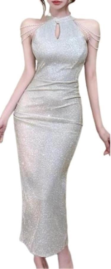 ボディラインを美しく見せてくれるタイトなシルエットのチャイナ 風 デザイン ドレス ワンピース。