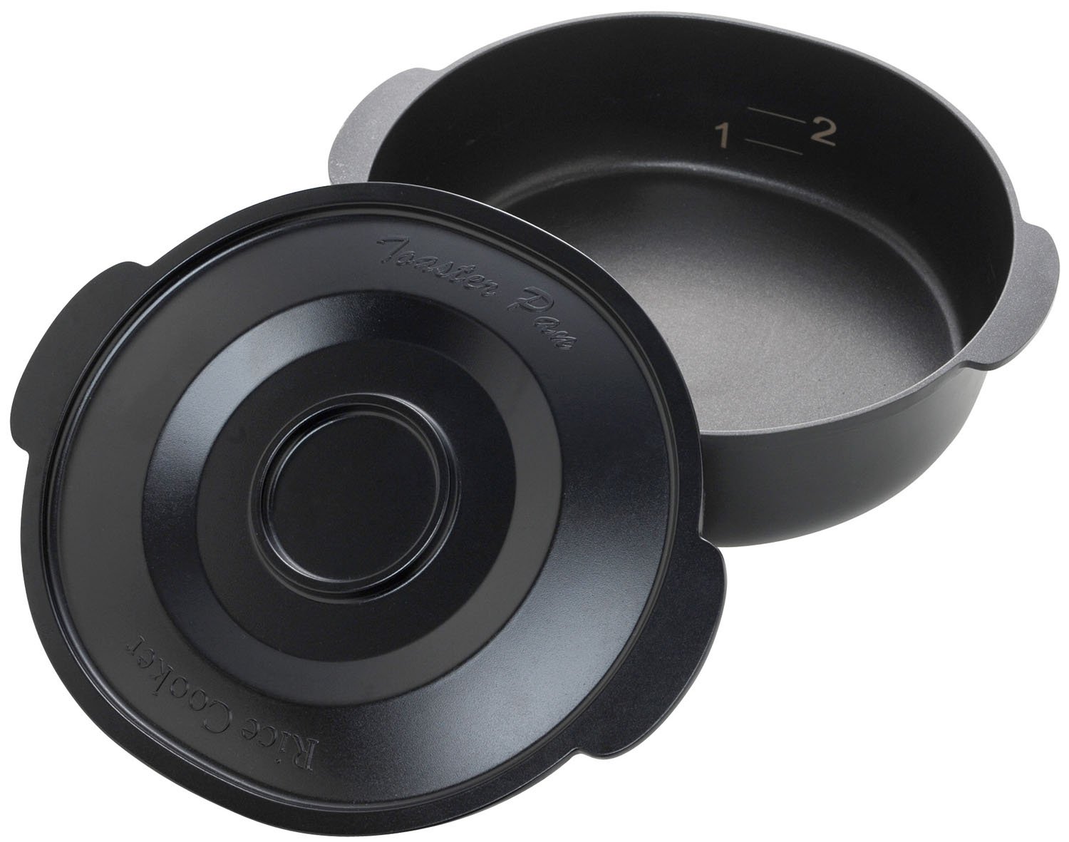 ●オーブントースターで煮る、焼く、炊くができるトースターパン●便利な1合と2合の目盛があり、かまどをイメージした形状です●白米の炊飯以外にも炊き込みご飯やリゾット、茶わん蒸し、スイーツなど葛恵子先生監修22品目専用レシピ付●素材を入れてトースターで焼くだけでパッとできるので、フライパンも鍋も不要。蓋をして焼くことで蒸し焼きになり、素材の味や香りを閉じ込めることができるので油や調味料が少量でできヘルシー●魚料理なども、においや煙を気にせず手軽に作れる●内面はフッ素加工でこびり付きにくく、しゃもじも鍋肌にそって盛りやすい●丸い形で、器として食卓にそのまま出すことが出来る●コルクの鍋敷きつき●セット内容:本体、蓋、鍋敷き、レシピ(24ページ)●満水容量:1500ml※オーブントースター専用。トースターにより入らない機種があります。庫内サイズをお確かめください。