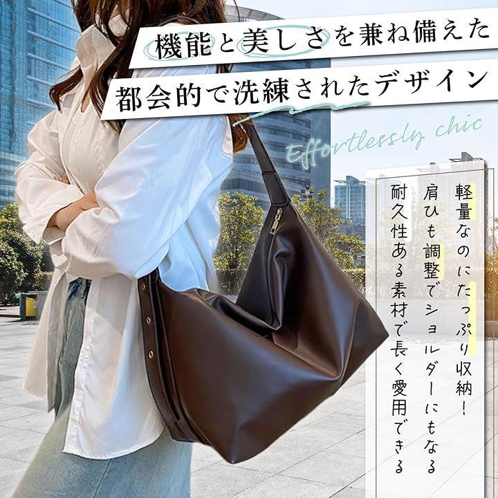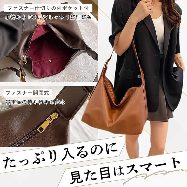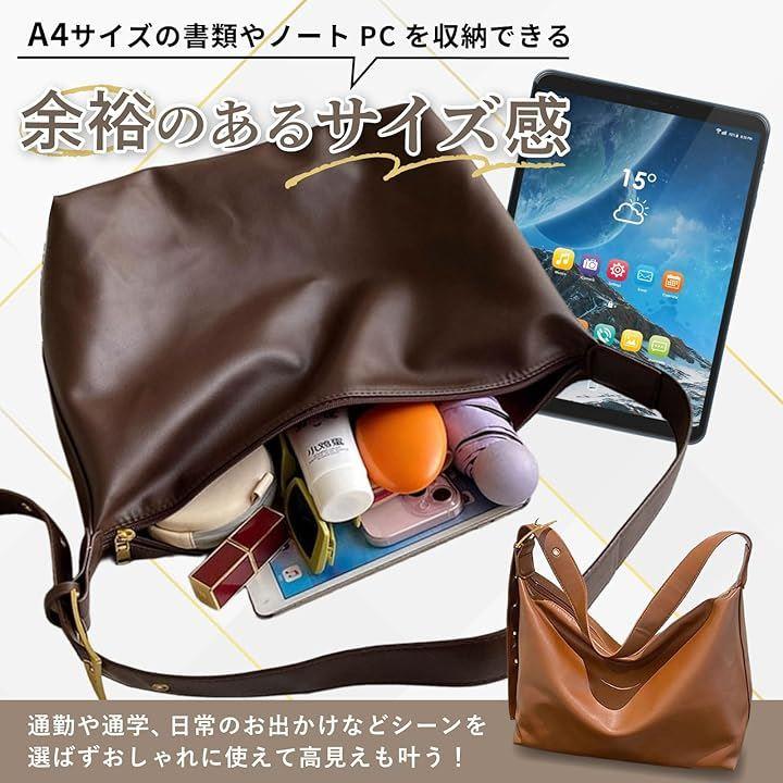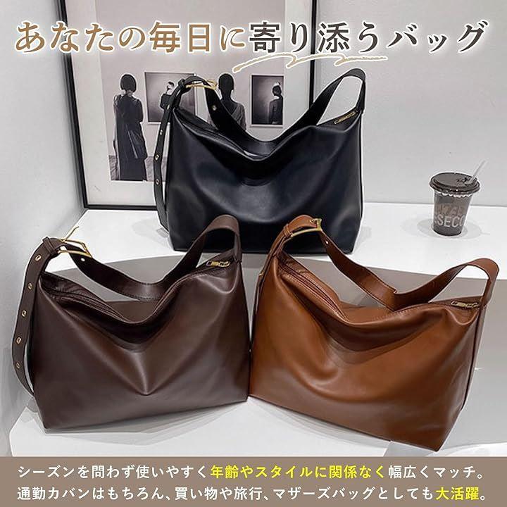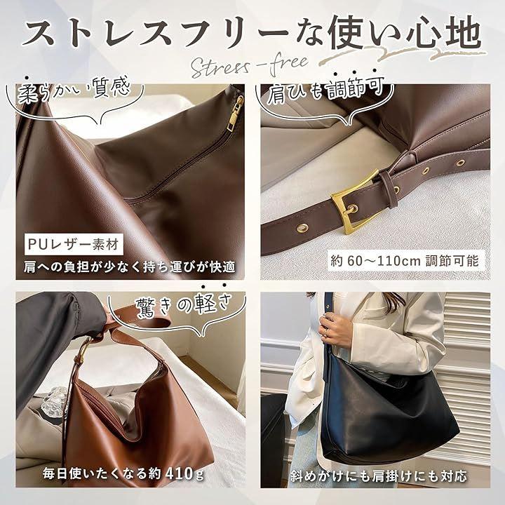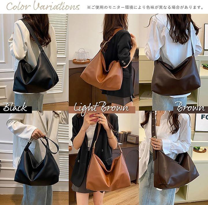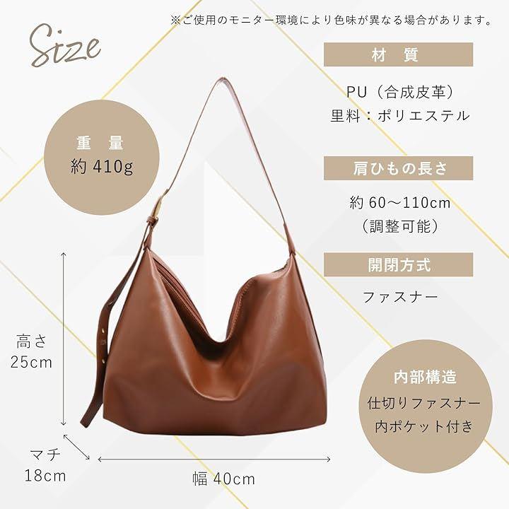 「商品仕様」材質:PU(合成皮革)、里料:ポリエステル、サイズ:約40x18x25cm、重量:約410g、肩ひもの長さ:約60~110cm(調整可能)、カラー:ブラック/ブラウン/ライトブラウン、内部構造:仕切りファスナー・内ポケット付き、開閉方式:ファスナー *ご使用のモニター環境により色味が異なる場合があります。