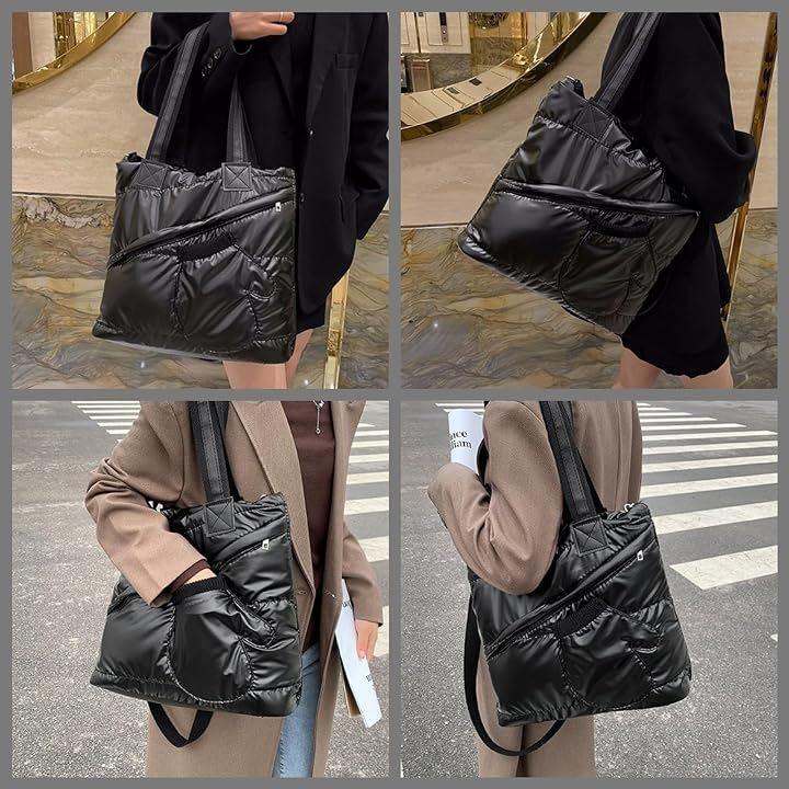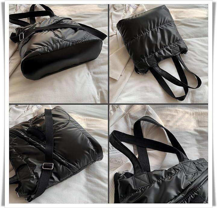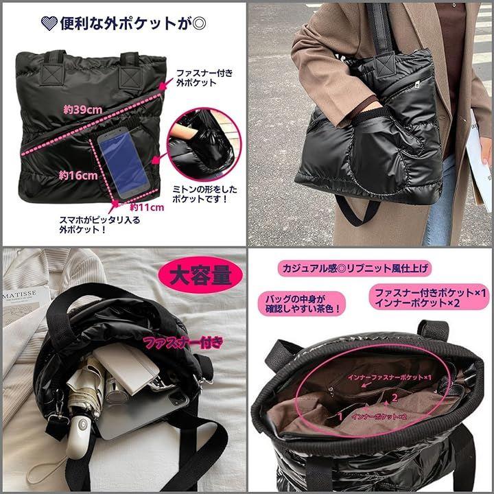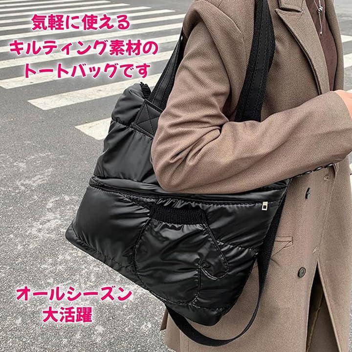 ナイロントートバッグ本体の表地はキルティングデザインのツヤ消しブラックタイプだから季節を問わず、 どんなコーデでも合わせられるバッグです. 軽量でふわふわ柔らか素材なので、とても使いやすくて。