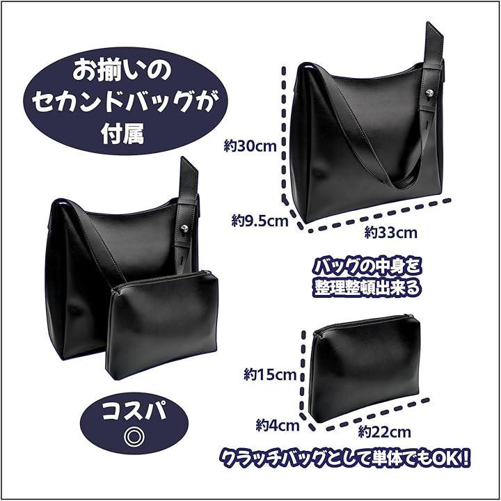 サイズ:バッグ本体 タテ約30cm ヨコ約33cm マチ約9.5cm ベルト長さ約38cm~約68cm調整可能 ベルト幅約3.5cm 重さ約370g / セカンドバッグ タテ約15cm ヨコ約22cm マチ約4cm 重さ約110g 素材:PUレザー