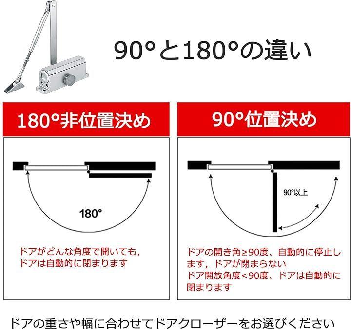 「商品紹介」 材質:アルミ合金、合金鋼 勝手: 左右兼用 重量:約0.9kg 耐久性:高周波30万回 停止角度:90度 適合扉: 木製ドア、アルミドア 扉幅(mm):1100以下 適用のドア重量:≤65kg