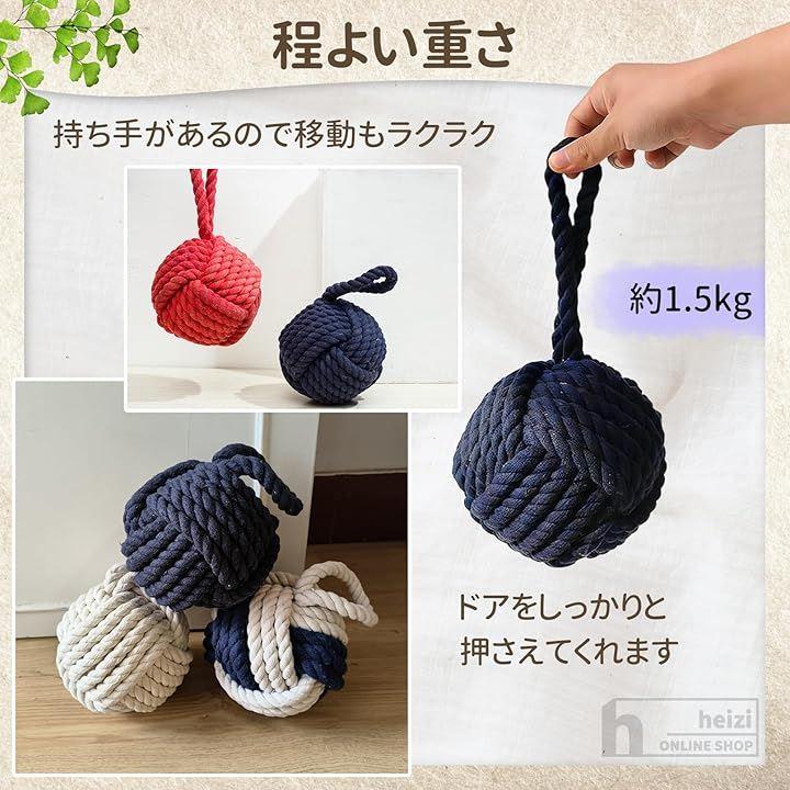 「商品内容」ドアストッパー サイズ:15x15x30(cm) 重量:約1.5kg カラー:ベージュ/ネイビー/レッド/ストライプよりお選びいただけます 素材:麻縄+セメント *モニターの環境により、色の見え方に若干差が生じる場合がございます。