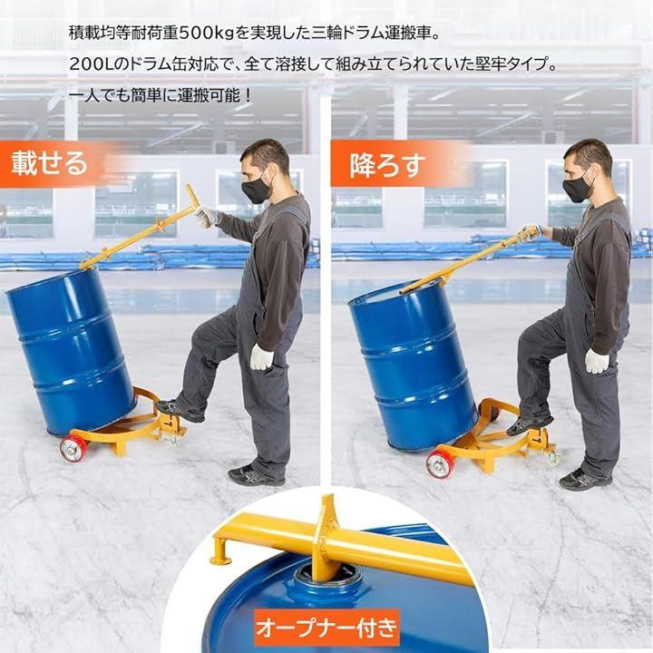 「オープナー付き」この三輪ドラム運搬車はオープナー付き、ドラム缶の蓋を開けることができます。