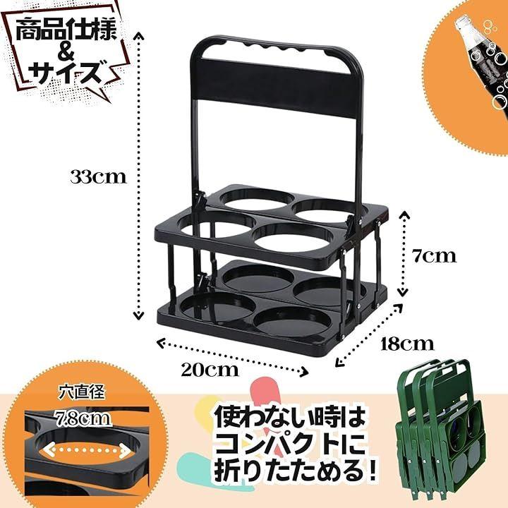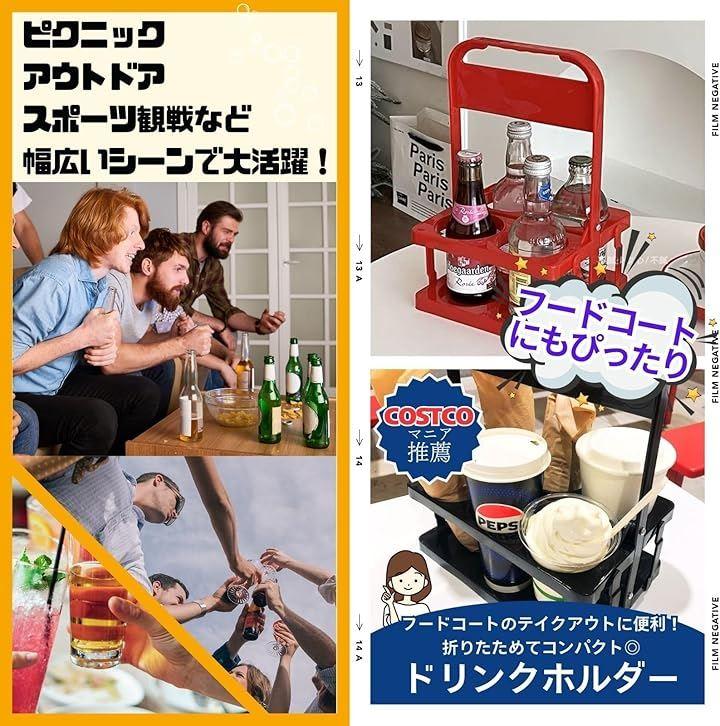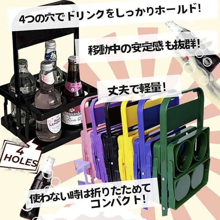 「持ち運びラクラク。」4本のドリンクを同時に運べる便利なドリンクホルダー。アウトドアやピクニック、バーベキューにぴったり。このドリンクホルダーは、最大4本のペットボトルや缶を一度にしっかりと持ち運べる設計で、手軽さと安定感を両立。