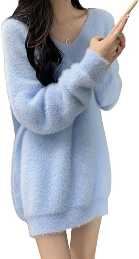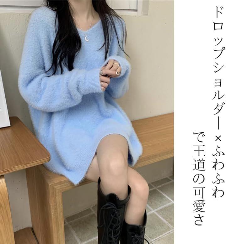 「ふわふわニットのミニワンピース」胸元を大きく見せるVネックのドロップショルダーと、ビッグシルエットのデザインが特徴的なふわふわ質感のミニワンピースです。