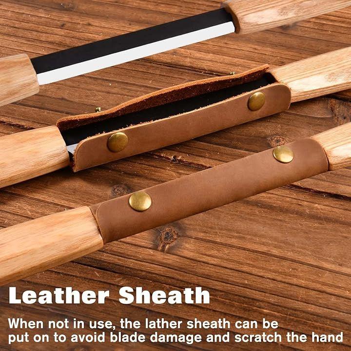 レザーシース: ドローナイフにはレザーシースが 1 つ付属しており、使用しないときは刃の損傷を避けるために装着でき、保管や持ち運びも簡単です
