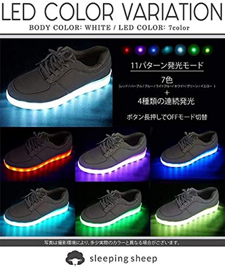 スニーカー内蔵のボタン(USB裏部分)を押すことで靴底のLEDライトが7色の発光パターンとレインボーに光ったり、フラッシュしたり4パターンの光り方でかなり目立つスニーカーです。