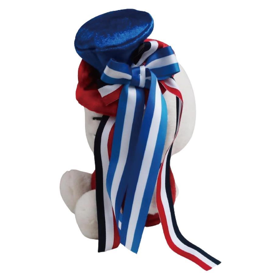 本体にはレトロ風なボアを使用。帽子やリボンでアニバーサリーらしくキラキラ生地を使用しています。