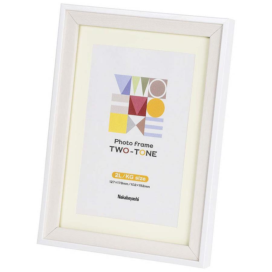 2種類の木目柄を合わせたツートンカラーのフォトフレーム。便利なマット台紙付。2種類のサイズに対応できます。 フレーム外形寸法:149x201x16mm、収納用紙寸法:127x178mm、フレーム窓寸法:118x169mm、マット窓寸法:92x142mm【規格:2L・KG判(マット使用時)】 本体重量:約145g 材質:フレーム素材/樹脂製(PS)、透明板/PET(0.5mm厚) スタンド付・吊り金具付