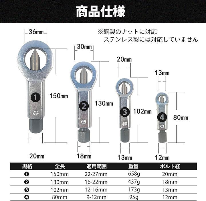 ナットブレーカー、ナットスプリッター、ナットカッターが含まれており、ステンレス製で耐久性があります。