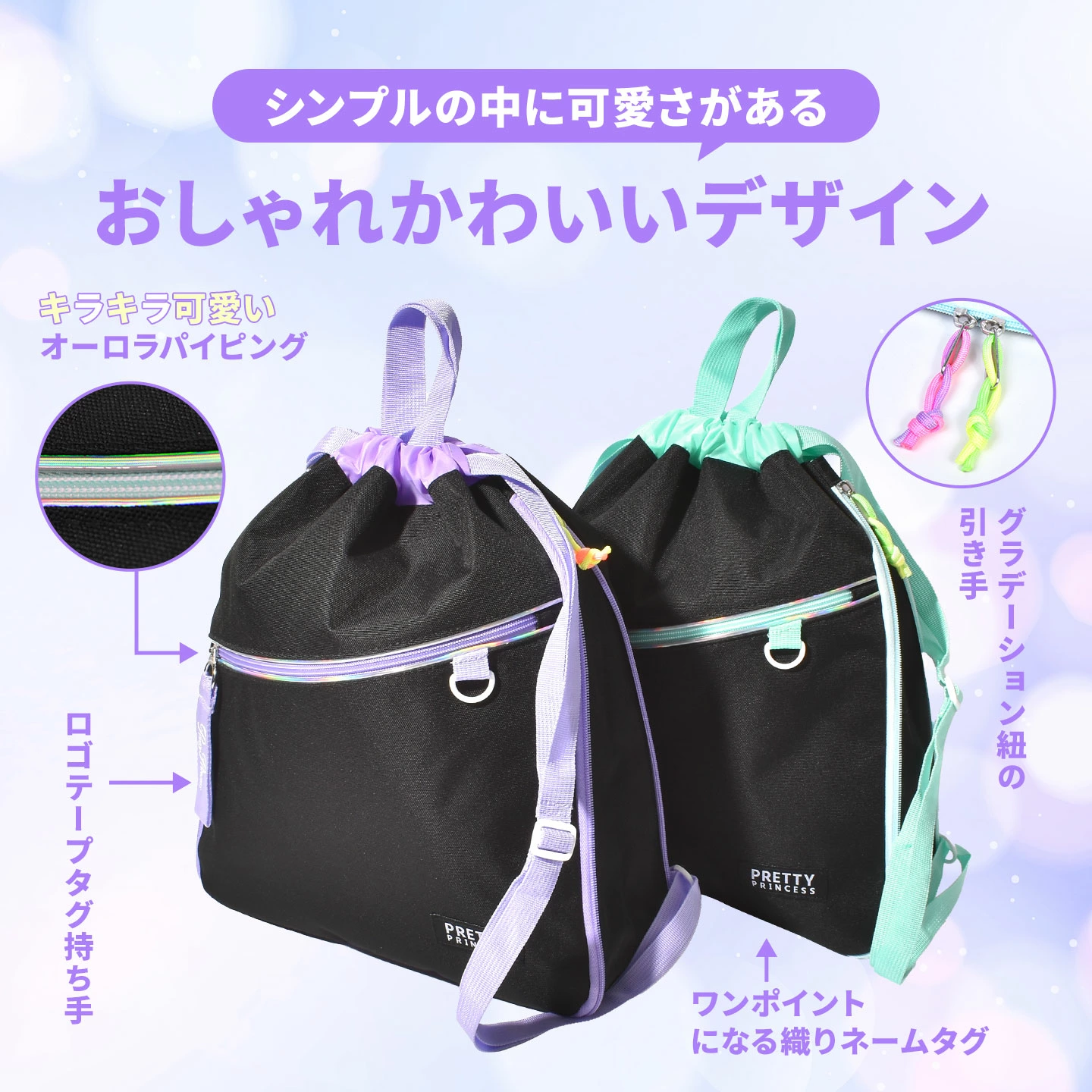■関連キーワードナップサック 女の子 プリティプリンセス Pritty Princess キッズナップサック かわいい 拡張 広がる マチあり 大容量 キッズ ジュニア A4 2way 着替え 体操服 入れ オーロラ キラキラ ラベンダー ミント リュック 遠足 修学旅行 新入学 新学期 サブリュック サブバッグ おしゃれ 小学生 低学年 高学年 長さ調節可能 入学準備 ポケット 子供 スポーツバッグ 習い事 通学 林間学校 部活 お出かけ 普段使い 可愛い 女子 ガール レディース 持ち手付き パステル 紫 ミニリュック バッグ 鞄 かばん 5歳 6歳 7歳 8歳 9歳 10歳 入園 準備 入園準備 通園 バースデー 誕生日 プレゼント プチ ミニ ギフト お祝い お返し 粗品 景品 送別会 イベント