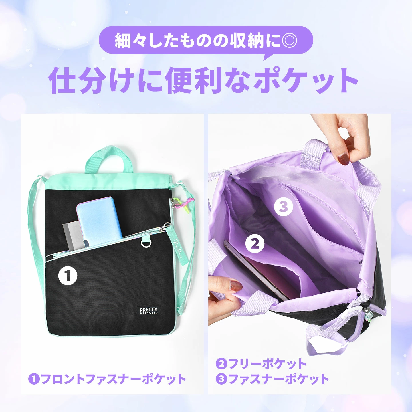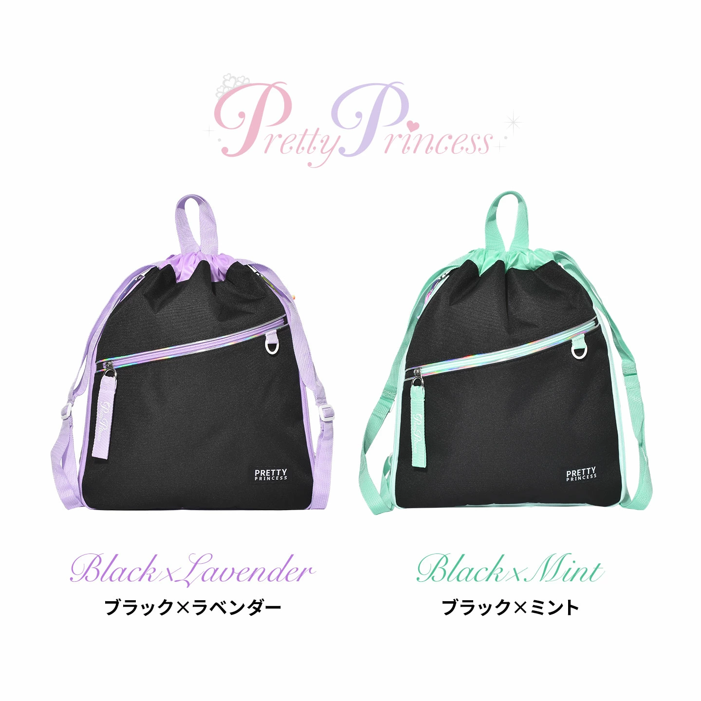 【キッズナップサック】大人っぽさのあるかわいさが◎Pritty Princessのキッズナップサック。口を絞ればリュックに、そのままで手提げとしても持てる2WAYタイプです。持ち手で机の横のフックに掛けることができます。