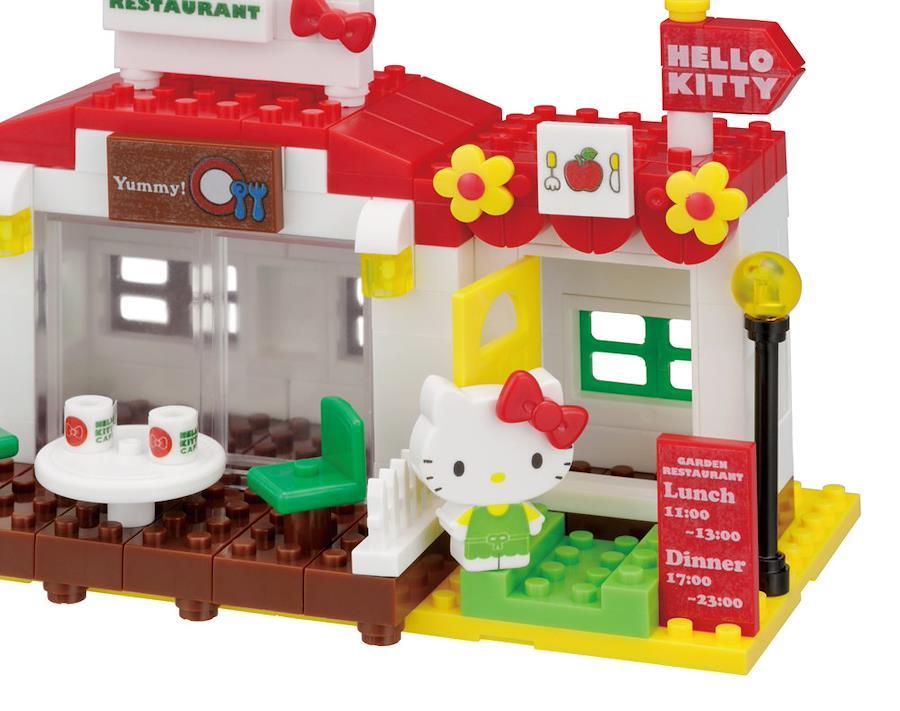 nanoblock+ (ナノブロックプラス) でハローキティの街をつくろう。Nanoblock+ (ナノブロックプラス) は、まだナノブロックでは遊べない小さなお子様でも簡単に遊べて、従来のダイヤブロックよりもリアルに完成度の高い作品を作ることができるサイズと特長を持ったブロックをお届けしたい、その事を第一に考えて開発された新しいブロックです。ハローキティの素敵なレストランが作れます。キティのリボンはお花・りんごとも付け替え可能です。