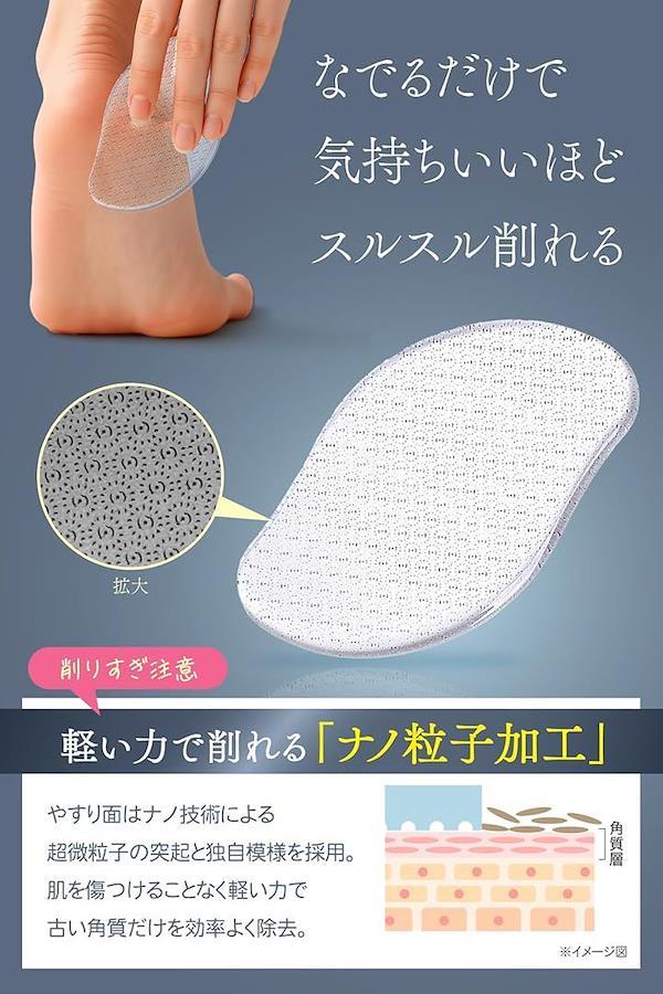 「ナノ粒子加工で強力&やさしい角質ケア」ナノサイズ粒子加工により、軽くなでるだけでかかとや足裏の古い角質を効率的に除去。