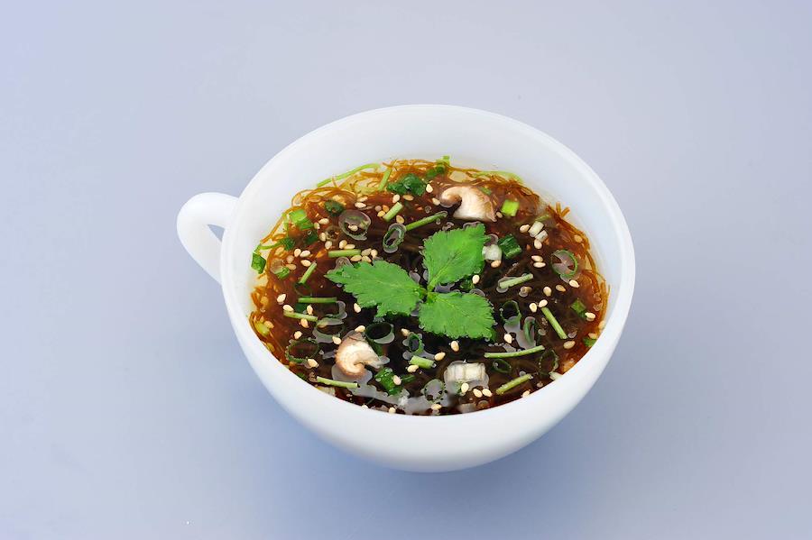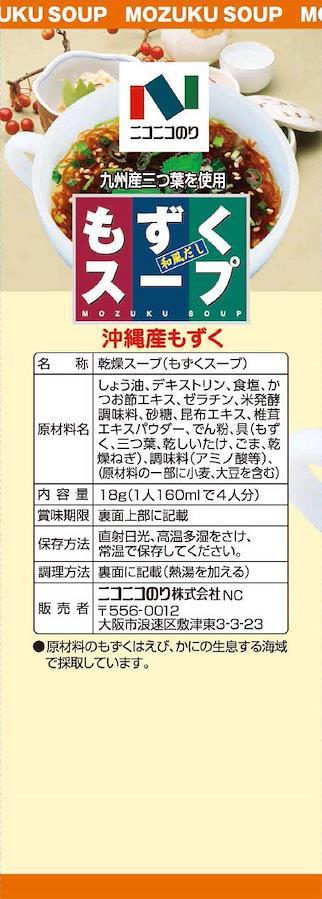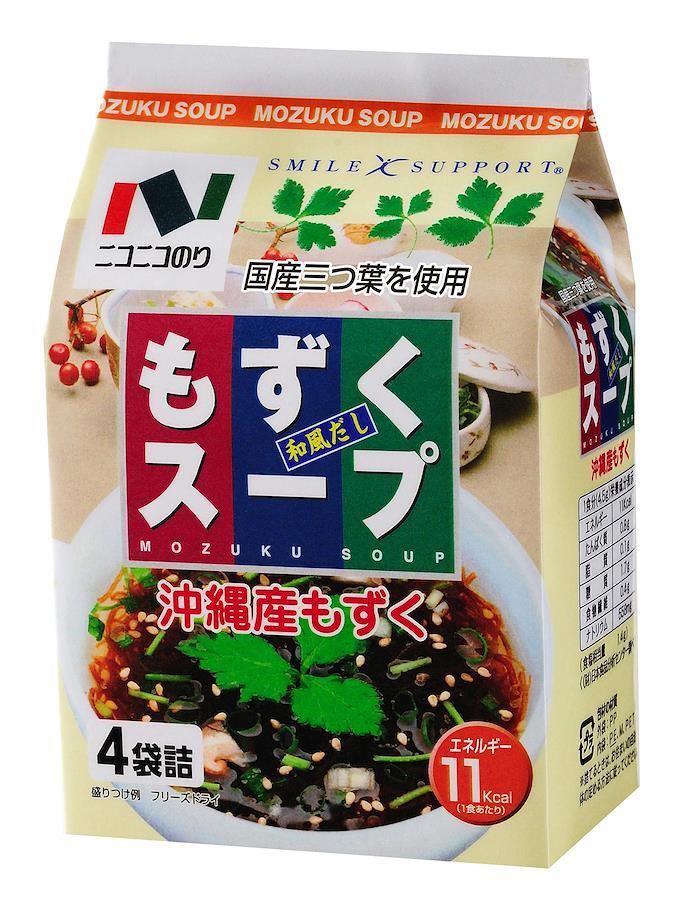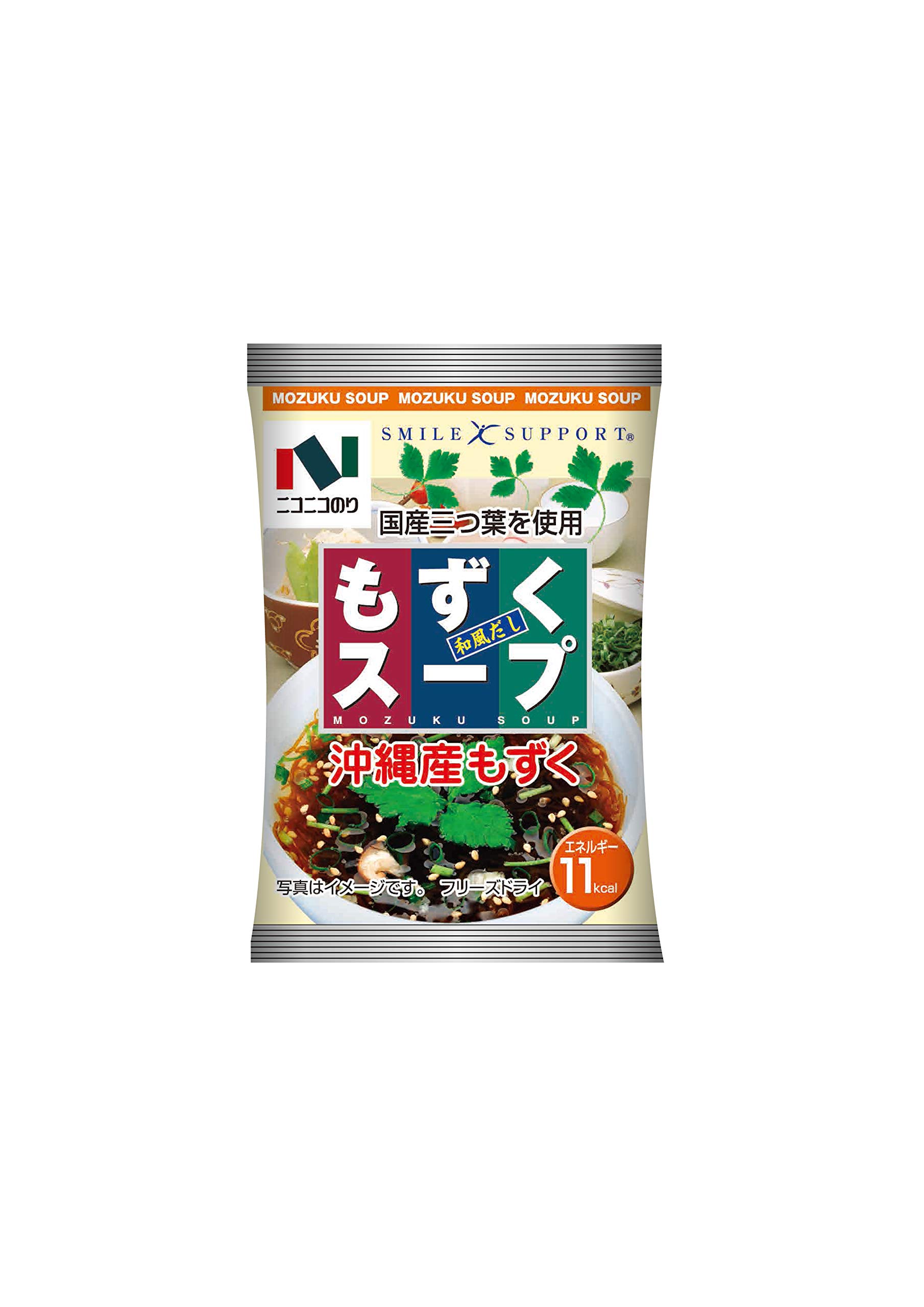 沖縄県産の早い時期に採れた柔らかい良質のもずくを使用します。九州産の三つ葉入でございます。和風だしベースのスープで、味に幅を持たせた旨味とコクが決めてでございます。お湯をかけるだけで簡単に出来上がるフリーズドライ商品でございます。1食11キロカロリーと控えめでございます。