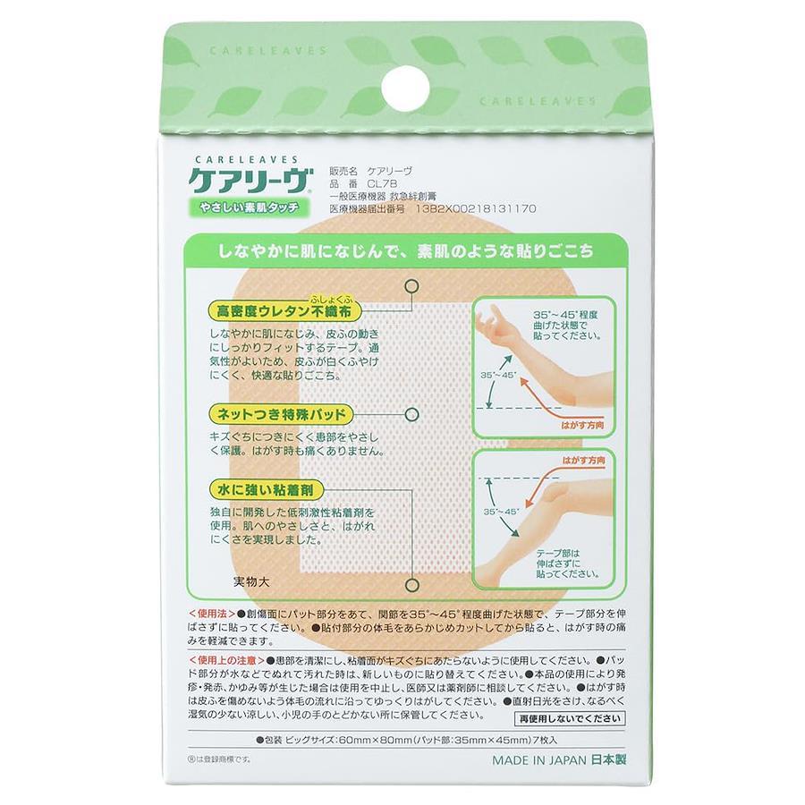 しっかり肌に馴染み、違和感はほとんどなし。関節に貼りやすい、木の葉形状の絆創膏です。ビッグ(60*80mm) 商品サイズ (幅×奥行×高さ) :83mm×15mm×112mm 原産国:日本 内容量:7枚