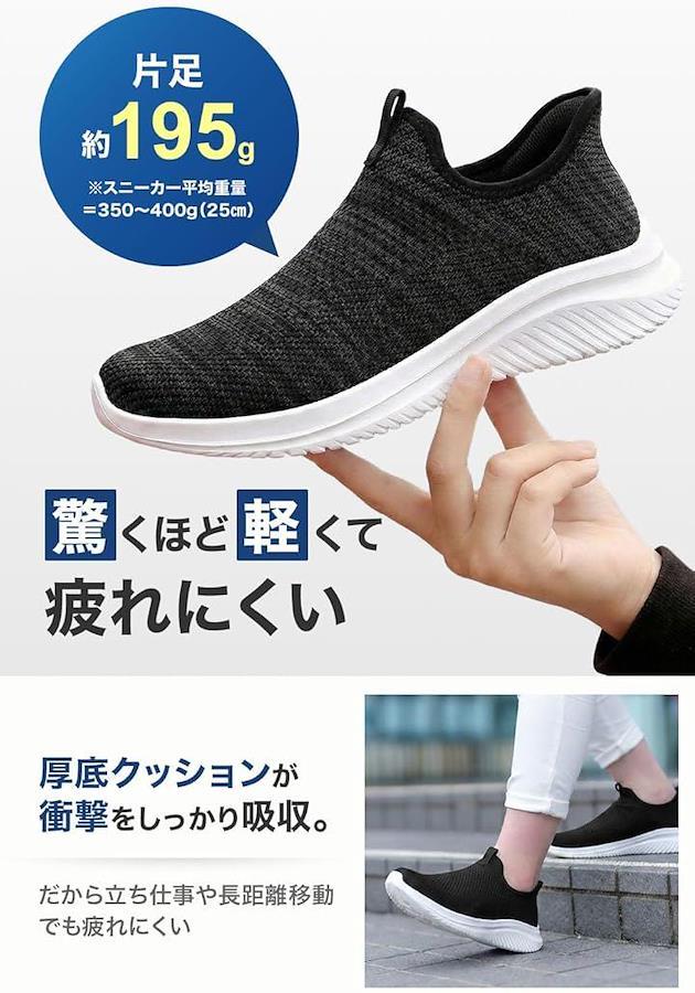 ・片足約195g(25cm)と驚くほどの軽さとクッション性で、足への負担が少なく足取りは軽快です。