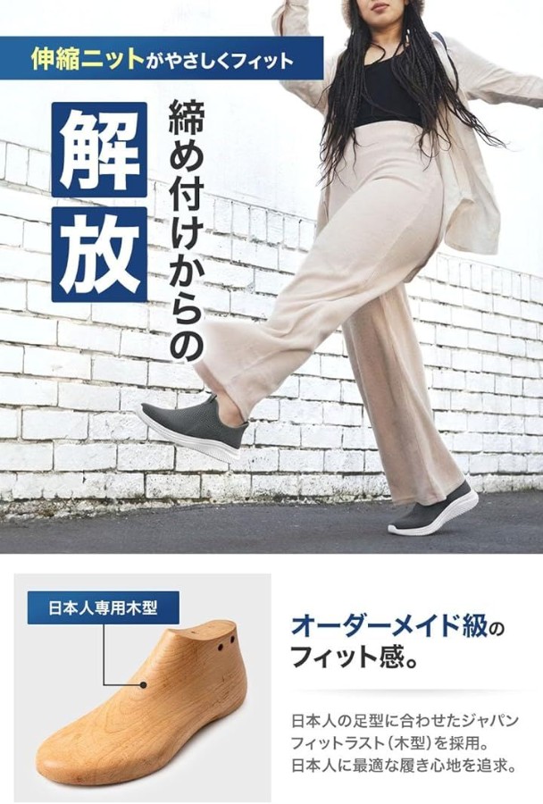 ハンズフリーシューズ」*使い始めは個体差により足入れしにくい場合がありますが、数回の着用でニットが馴染み、スムーズになります。
