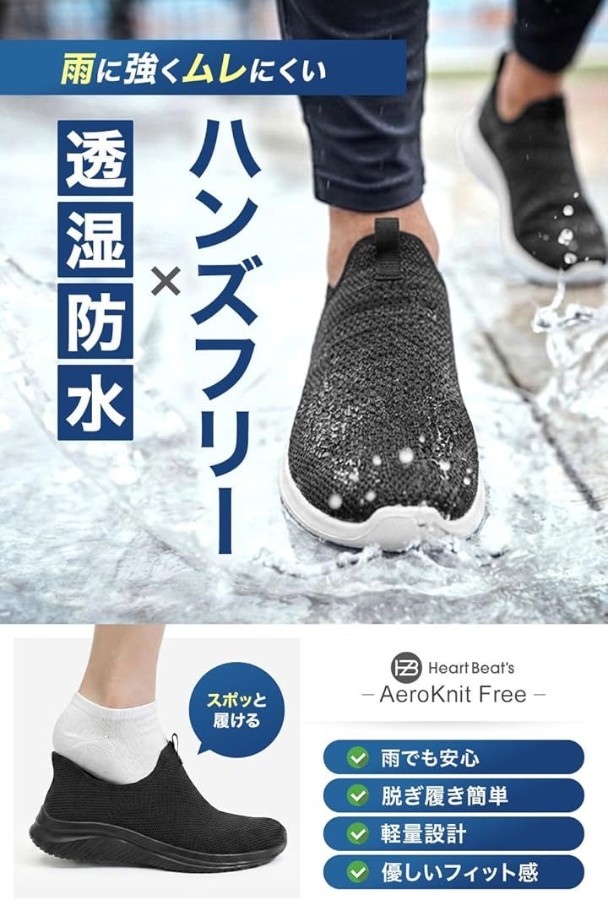 AeroKnit Freeは、脱ぎ履きの手間や突然の雨、長時間歩いたときの疲れなど、足元の「小さなストレス」を軽くするハンズフリー(スリップイン)タイプのニットシューズです。