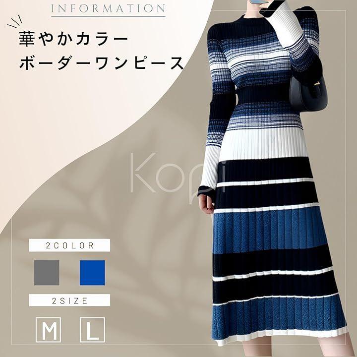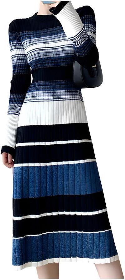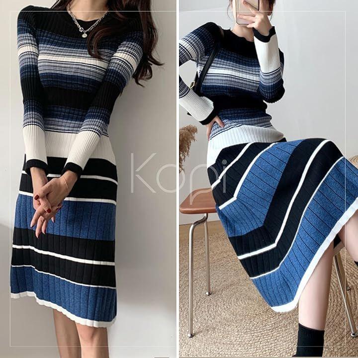 Knee-length knit dress, women's, tight fit, long sleeves, striped, A-line, elegant, long dress, flared, multi-color, midi length, girly, date, elegant, short, midi style, flashy, Korean style