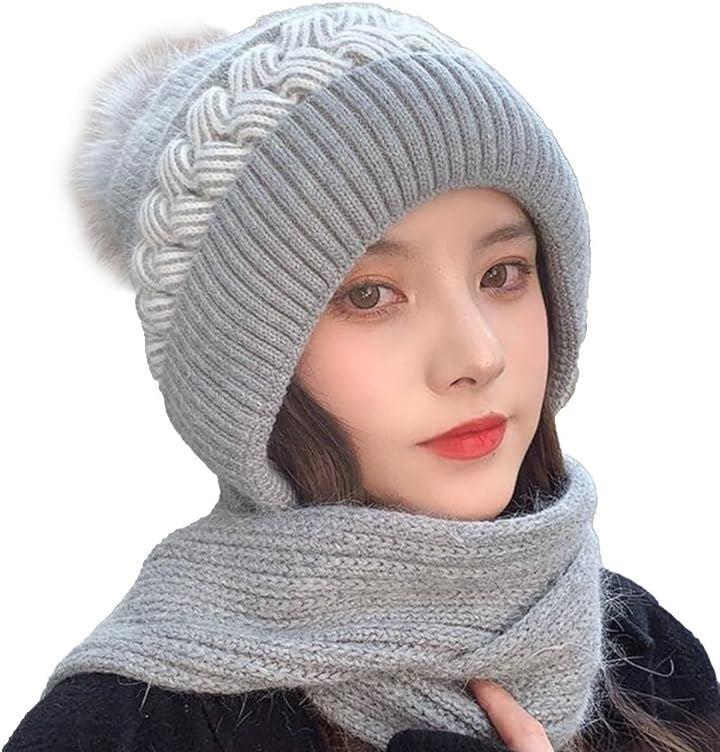 マフラーと一体型で首回りまでしっかり暖かい保温性抜群の女性用の帽子です