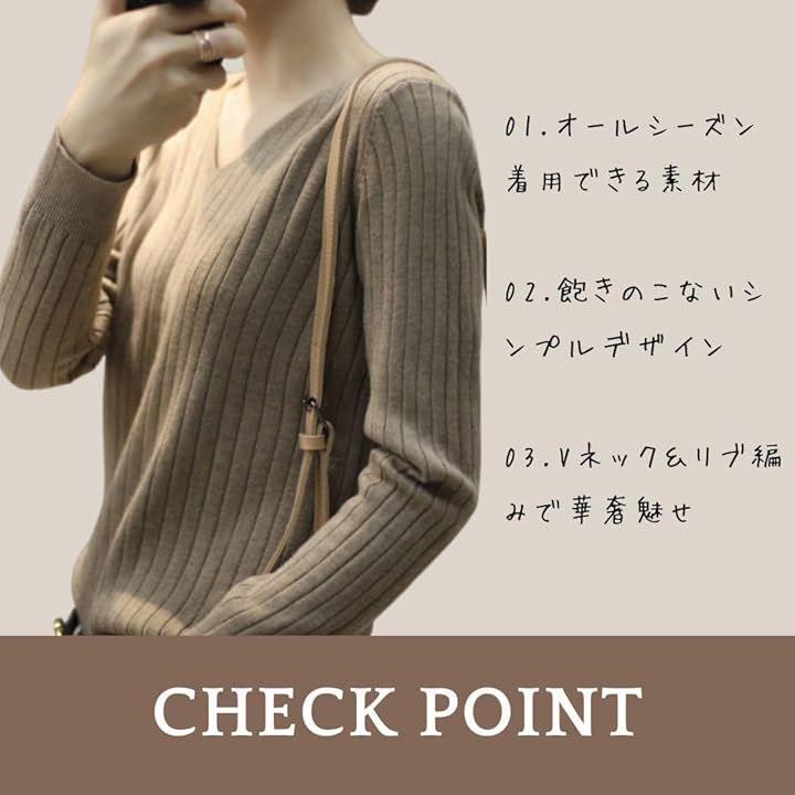 「綺麗に見せるVネック」 首元を美しく見せてくれるVネックに、細めのリブ編みがしっかり縦ラインを強調してくれます。
