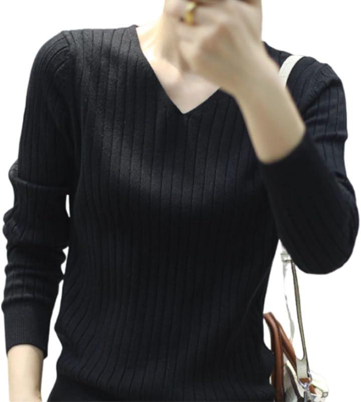 「綺麗に見せるVネック」 首元を美しく見せてくれるVネックに、細めのリブ編みがしっかり縦ラインを強調してくれます。