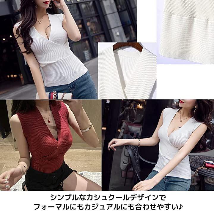 [FUPUTWO]ニットレディースセクシーノースリーブセーターVネックトップス胸元リブカシュクールカットソー