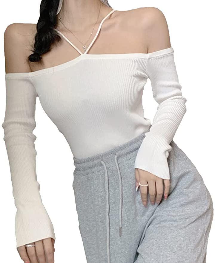 大胆な肩出しデザインの無地のレディースニットトップスです。