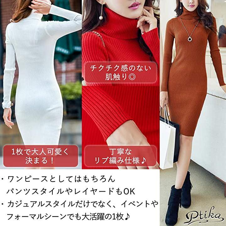Ptikaニットワンピースレディース秋冬タートルネックタイト長袖アクサセリー付き