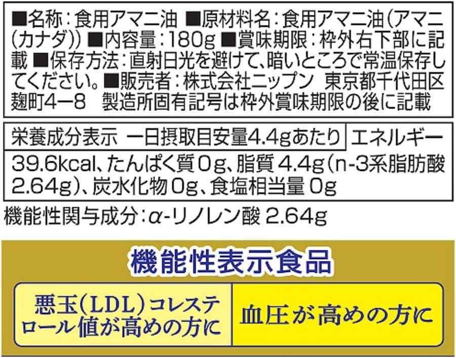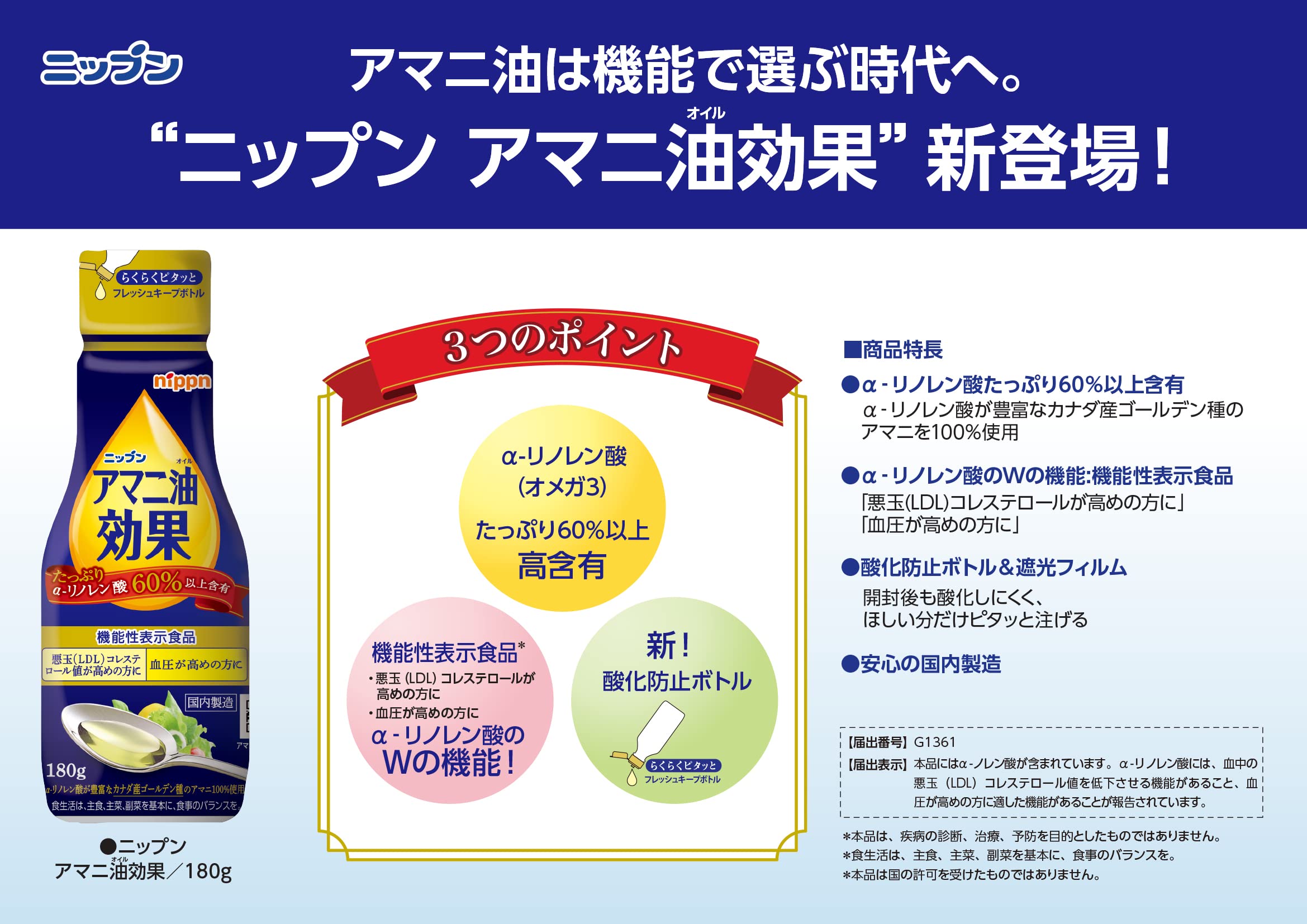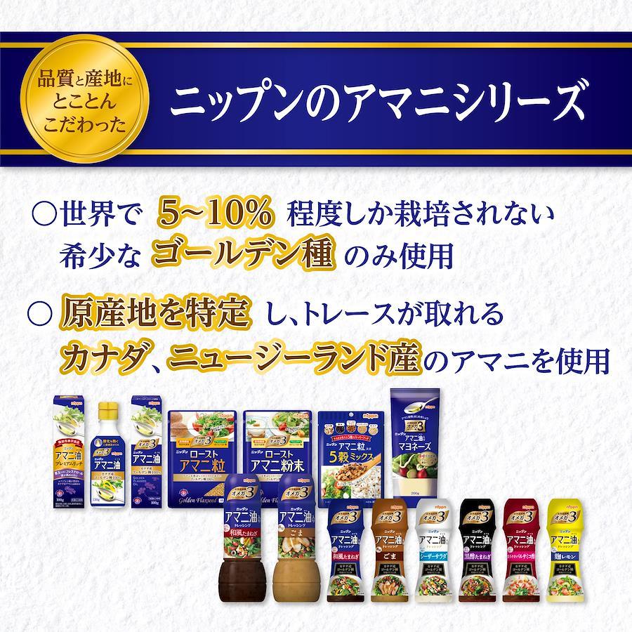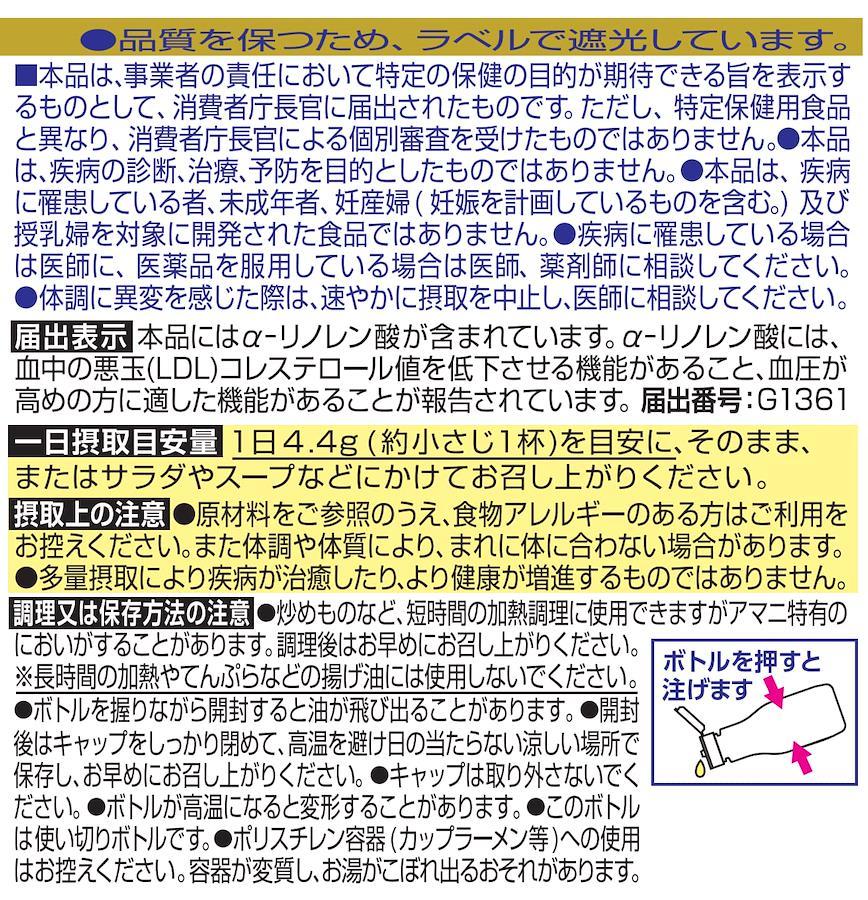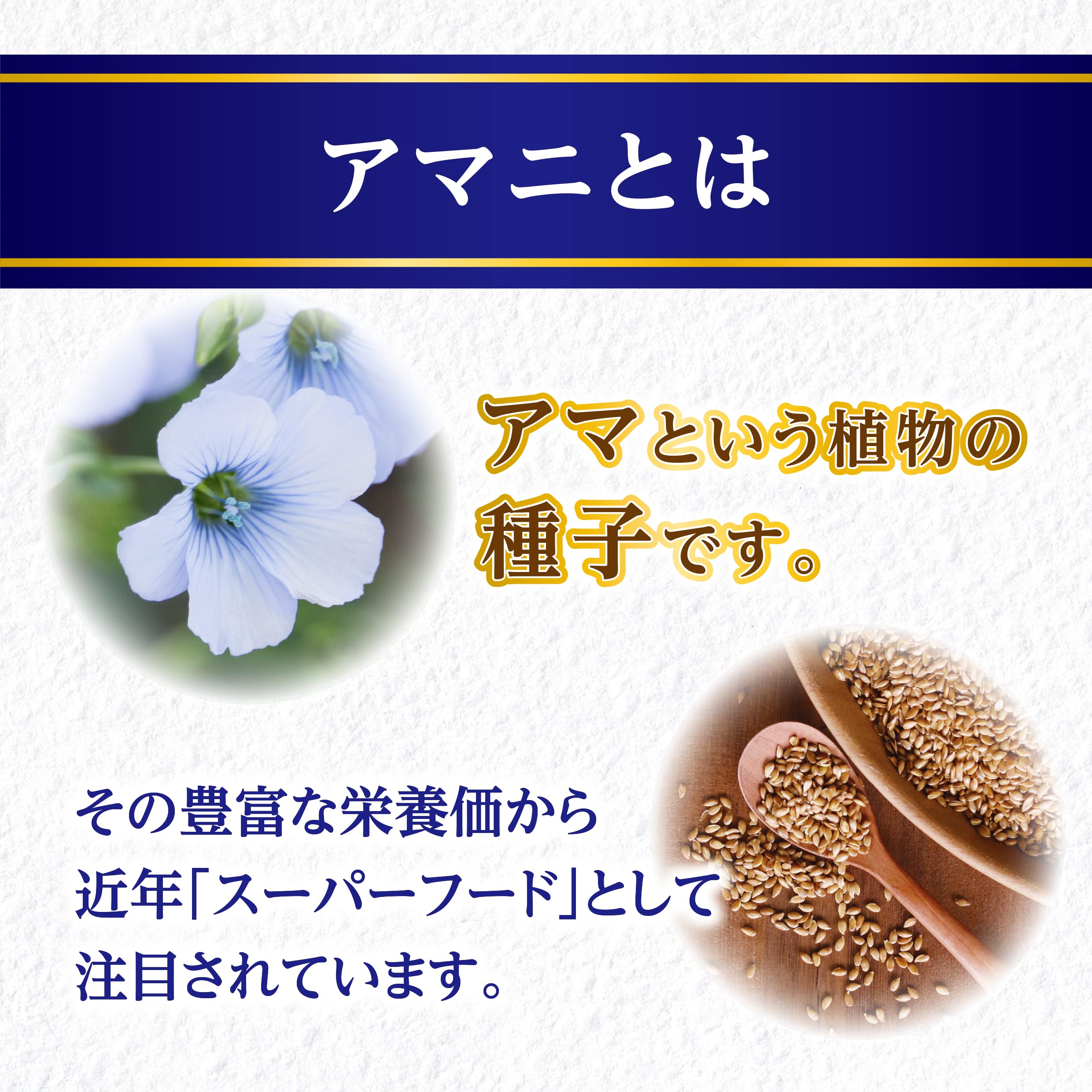 たっぷりα-リノレン酸60%以上含有。「悪玉(LDL)コレステロール値が高めの方に」「血圧が高めの方に」ダブルの効果がある機能性表示食品。カナダ産ゴールデン種のアマニを100%使用し、国内製造した安心の品質。効率的にα-リノレン酸を摂取できます。クセが無いのでそのままでも、サラダやスープ、野菜ジュースにかけるのもおすすめです!