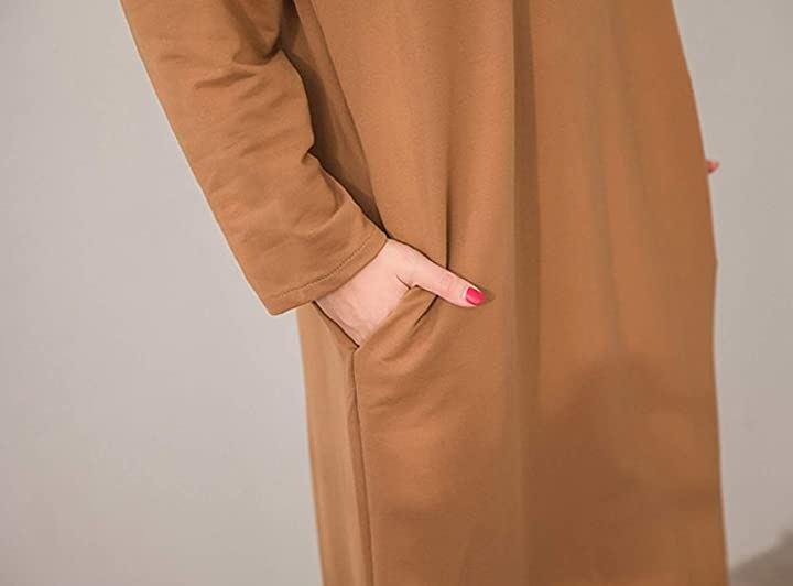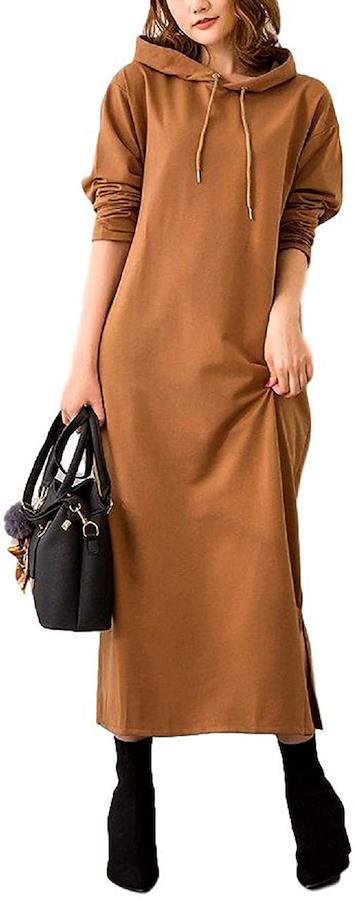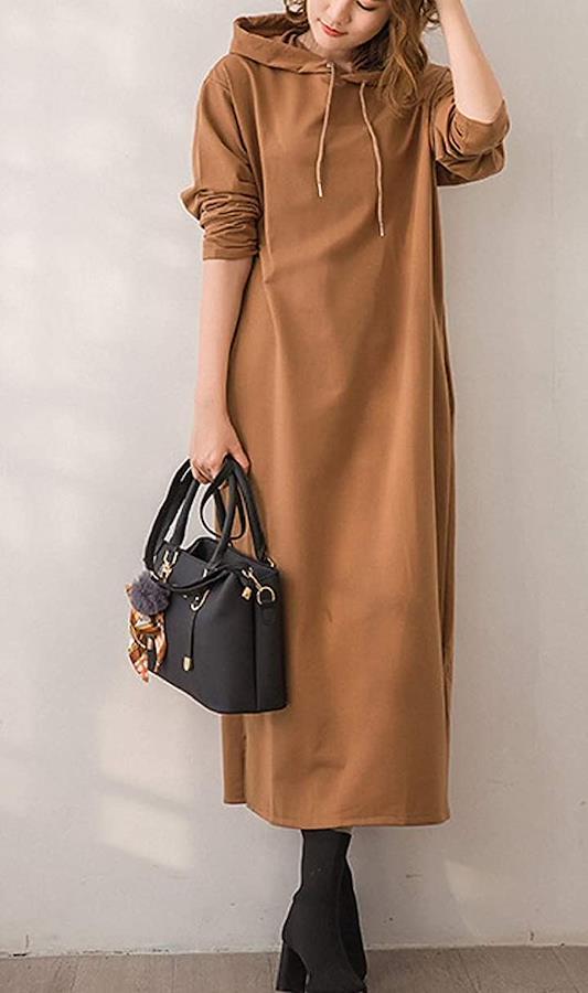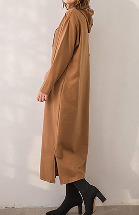 腰脇にポケットが付いているので、すっきりとした印象になり、シンプルコーデでもお洒落に決まる大人のパーカーワンピ・