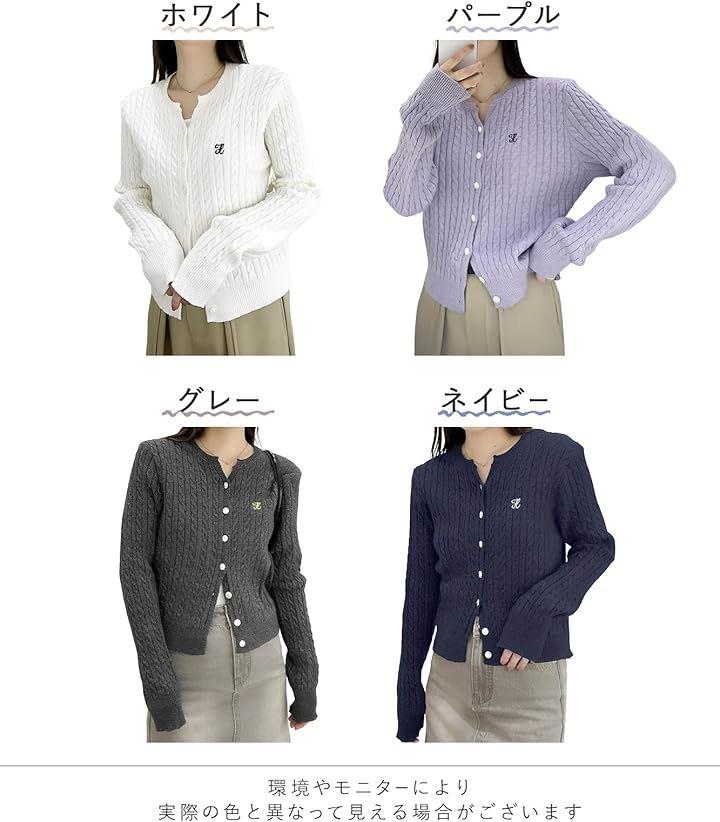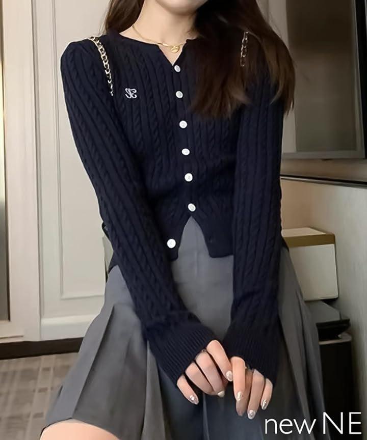 「女性らしさを引き立てるニットカーディガン」もっちりとした伸縮性のあるニット素材が心地よいカーディガンの登場です。シンプルなワンカラーデザインに、胸元のアルファベット刺繍がさりげなく可愛らしさをプラス。