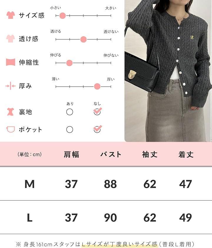 サイズ:肩幅/バスト/袖丈/着丈 「M」37/88/62/47 「L」37/90/62/49