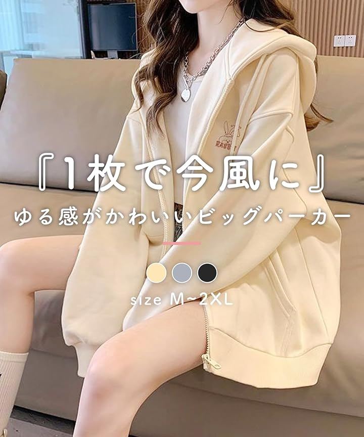 「胸元のラビットロゴがキュートなビッグパーカー」シンプルなワンカラーデザインが何とでも合わせやすいフルジップパーカーが登場しました。