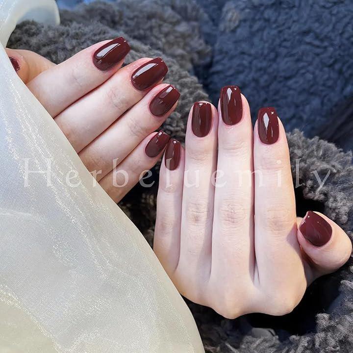 「トレンドのブラウン味がかったレッド(赤)ネイル」ボルドーが大人っぽい印象の艶がきれいなネイルチップ。