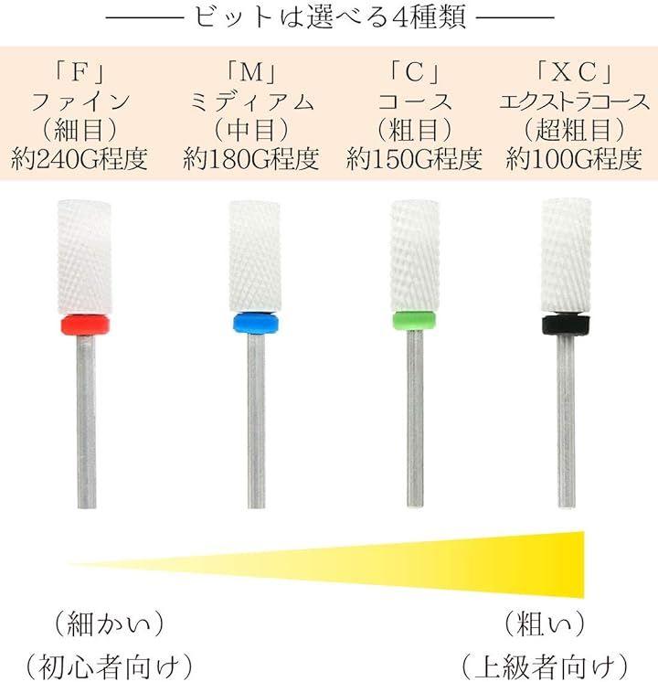 ビットの種類(粗さ):「XC」約100G/「C」約150G/「M」約180G/「F」約240Gとあります。