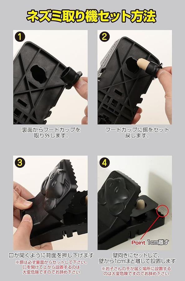 ⚫︎餌をフードカップに入れネズミ捕りに戻し、ネズミ捕りを開いて頂くだけで屋外でも屋内でもネズミ捕り使用して頂けます。