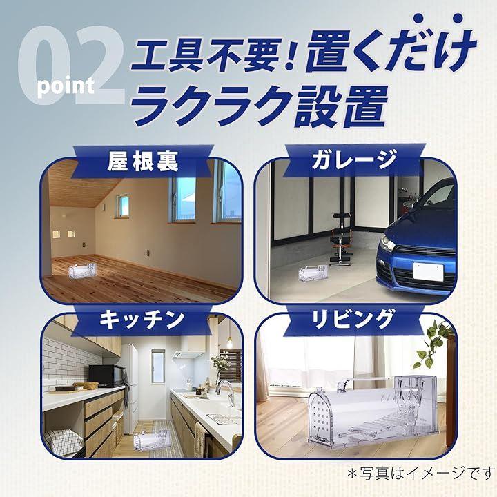 「薬剤不要で安全に捕獲」ネズミ捕りは屋内でのネズミ駆除に役立つ捕獲器具で、忌避剤や粘着シートを使用せず安全に捕獲できる設計です。