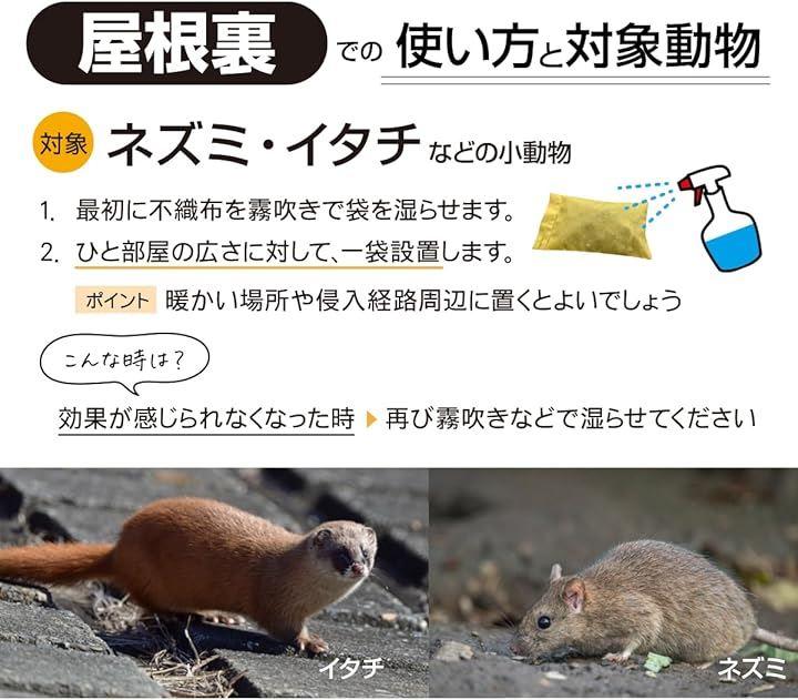 「対象動物と設置箇所」ベランダ:コウモリ、カラス、鳩/屋根裏:イタチ、ネズミなどの小動物