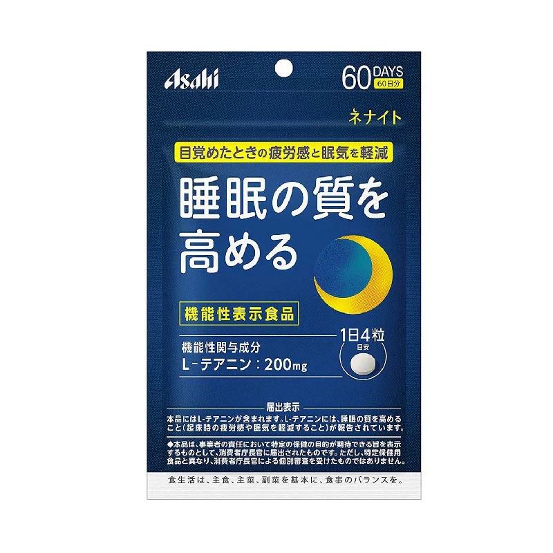 【ネナイト 60日分の商品詳細】●【届出表示】本品にはL-テアニンが含まれます。L-テアニンには、睡眠の質を高めること(起床時の疲労感や眠気を軽減すること)が報告されています。●テアニンは緑茶に含まれている旨み成分で、アミノ酸の一種です。●1日目安量4粒に、L-テアニン200mg配合【召し上がり方】1日摂取目安量:4粒が目安摂取方法:就寝前に水又はお湯とともにお召し上がりください。【ネナイト 60日分の原材料】還元麦芽糖水飴、デンプン/結晶セルロース、L-テアニン、ステアリン酸カルシウム、微粒酸化ケイ素、糊料(グァーガム)【栄養成分】(1日4粒(1120mg)あたり)エネルギー・・・4.51kcaLたんぱく質・・・0.23g脂質・・・0.039g炭水化物・・・0.81g食塩相当量・・・0g(機能性関与成分)L-テアニン・・・200mg【注意事項】・本品は、事業者の責任において特定の保健の目的が期待できる旨を表示するものとして、消費者庁長官に届出されたものです。ただし、特定保健用食品と異なり、消費者庁長官による個別審査を受けたものではありません。・本品は、疾病の診断、治療、予防を目的としたものではありません。・本品は、疾病に罹患している者、未成年者、妊産婦(妊娠を計画している者を含む。)及び授乳婦を対象に開発された食品ではありません。・疾病に罹患している場合は医師に、医薬品を服用している場合は医師、薬剤師に相談してください。・体調に異変を感じた際は、速やかに摂取を中止し、医師に相談してください。・食生活は、主食、主菜、副菜を基本に、食事のバランスを。★摂取上の注意・1日の摂取目安量を守ってください。・高血圧治療薬または興奮剤を服用している場合は、本品の摂取を避けてください。・小児の手の届かない所に保管してください。★保存方法の注意・品質保持のため、チャックをしっかり閉めて保管してください。【原産国】日本【発売元、製造元、輸入元又は販売元】アサヒグループ食品リニューアルに伴い、パッケージ・内容等予告なく変更する場合がございます。予めご了承ください。