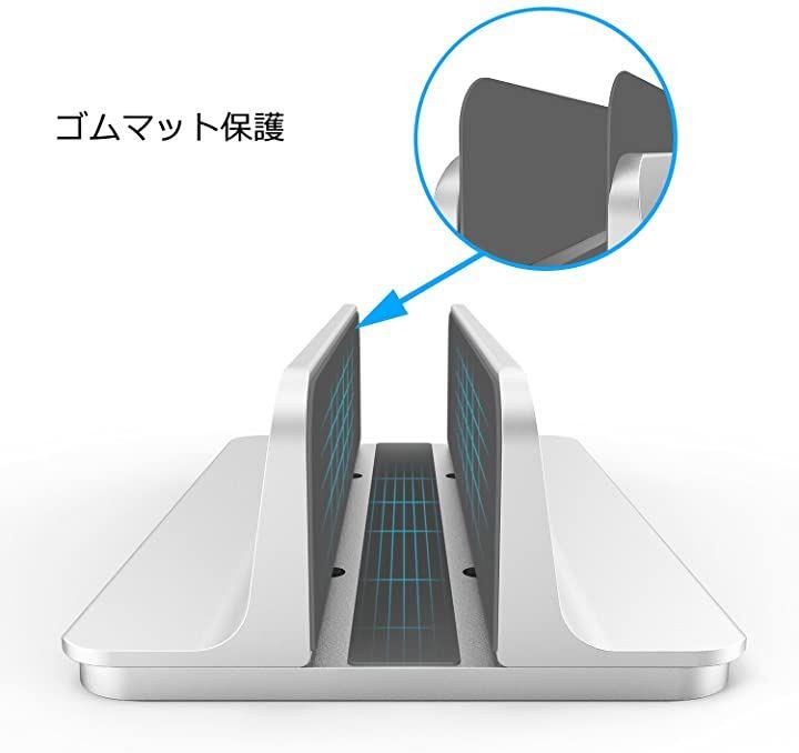 Macのクラムシェルモードや縦充電や机周りの整理整頓やデスクスペースを有効に活用したい時に超便利。本体はApple製品と相性のいいアルミニウム素材を使用し、機器と接する部分はゴムマットを採用し、傷つけにくいです。