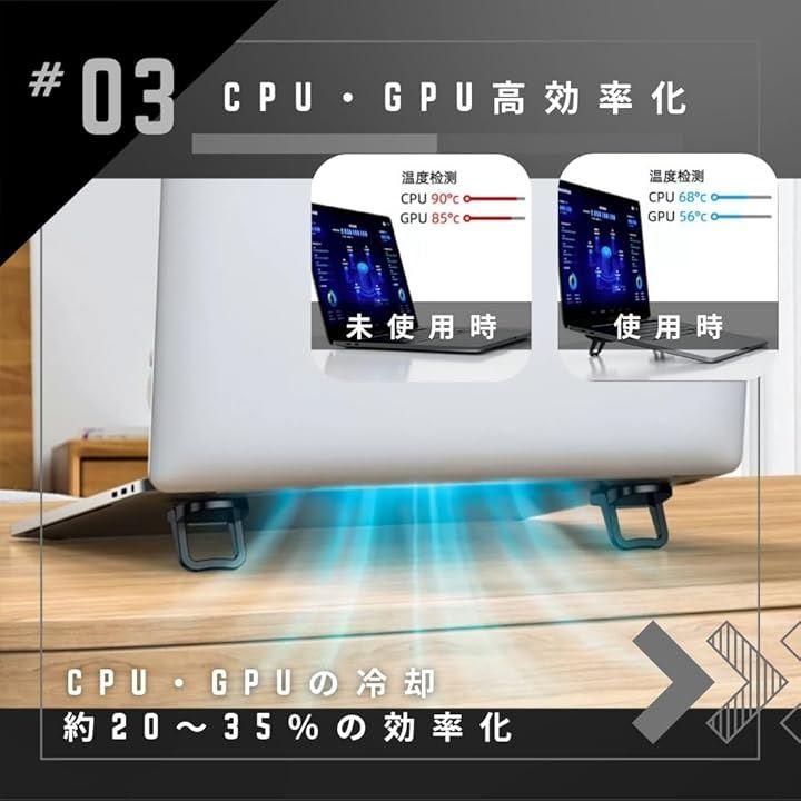 「CPU・GPU高効率化」本製品を使用することによりCPU・GPUの冷却が効率化し、ノートPCのパフォーマンス向上に貢献します。