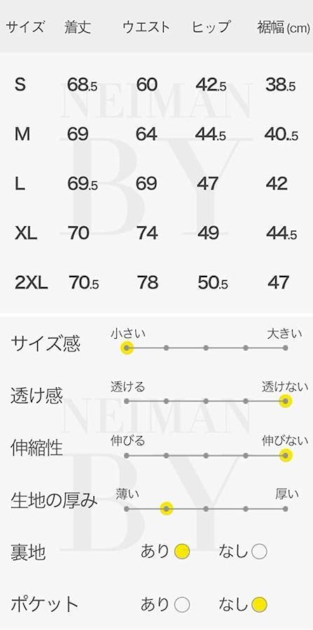 サイズ:着丈/ウエスト/ヒップ/裾幅(cm)「S」68.5/60/42.5/38.5「M」69/64/44.5/40.5「L」69.5/69/47/42「XL」70/74/49/44.5「XXL」70.5/78/50.5/47