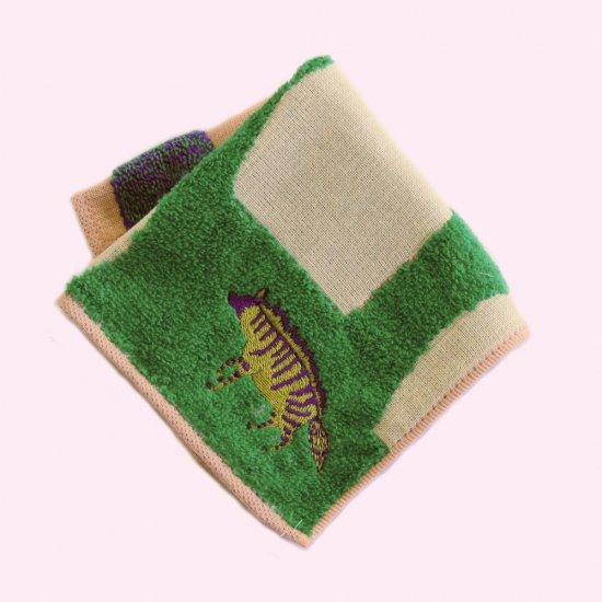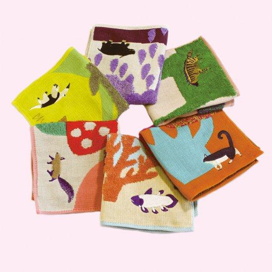 画家・イラストレーター・刺繍作家として活躍する森田MiWさんの、不思議であたたかな世界をカラフルな刺しゅうで表現しました。裏にも刺しゅうが施されたガーゼ・パイルハンカチは、肌触りがよく吸水性にも優れています。