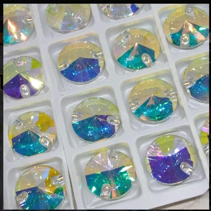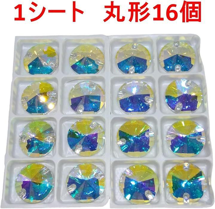 「素材」高品質クリスタルガラス(AB加工) 「仕様」縫い付け用両端穴2つ 「形状」丸形 「販売単位」各サイズ別トレー1つで販売(トレー内の個数はサイズ別)